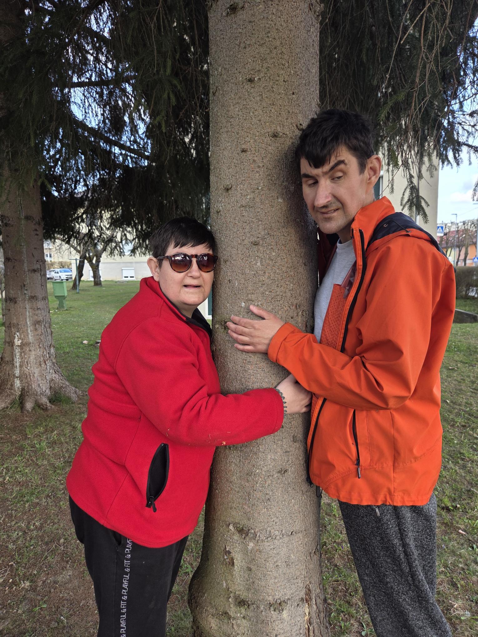 Odpravili smo se na sprehod do parka, kjer smo si med drevesi poiskali prijeten kotiček v naravi. Tam smo preizkusili nekaj posebnega – objemanje dreves. Vsak si je izbral svoje drevo, ga objel, se naslonil nanj in za trenutek začutil stik z naravo.
