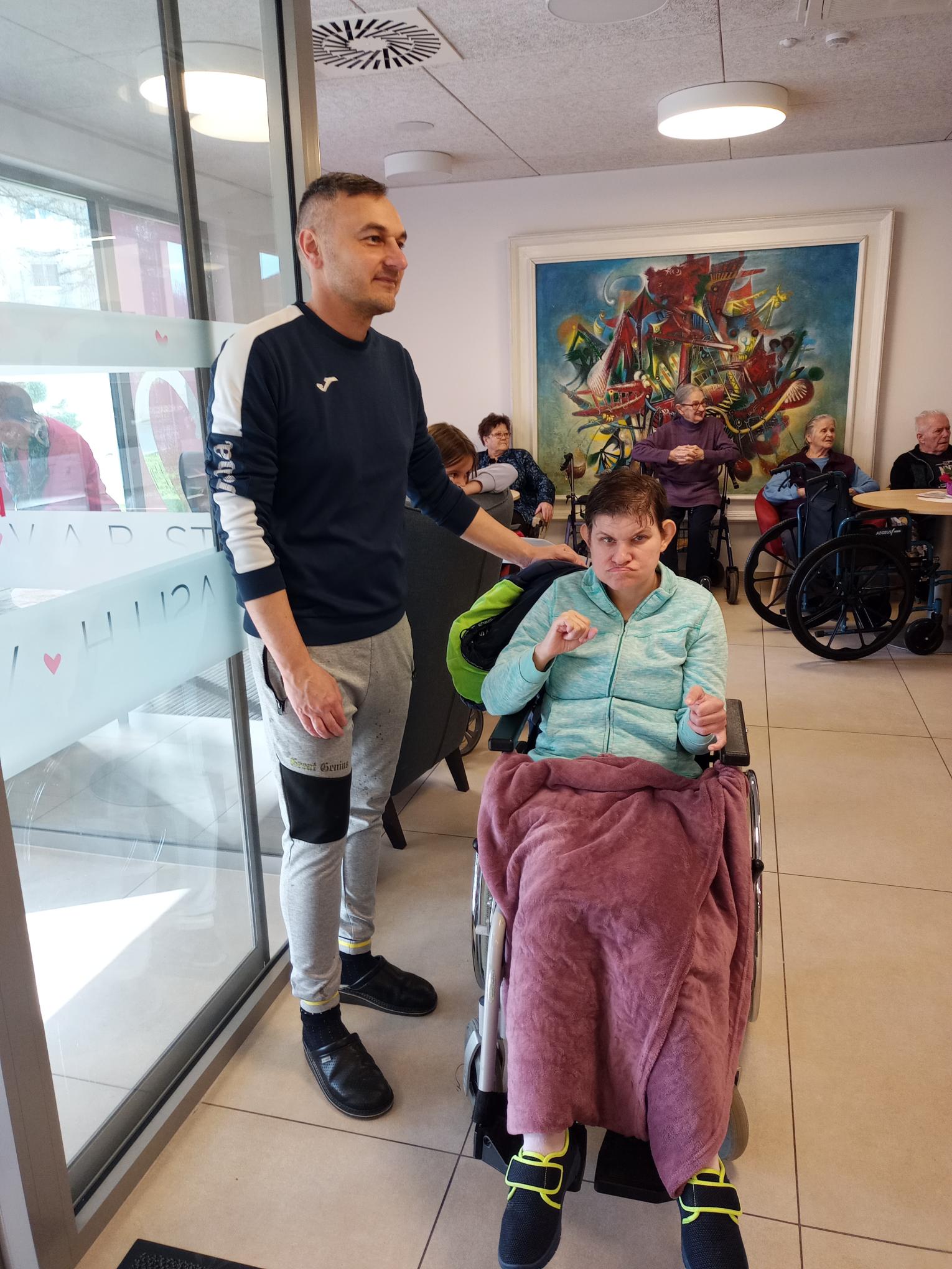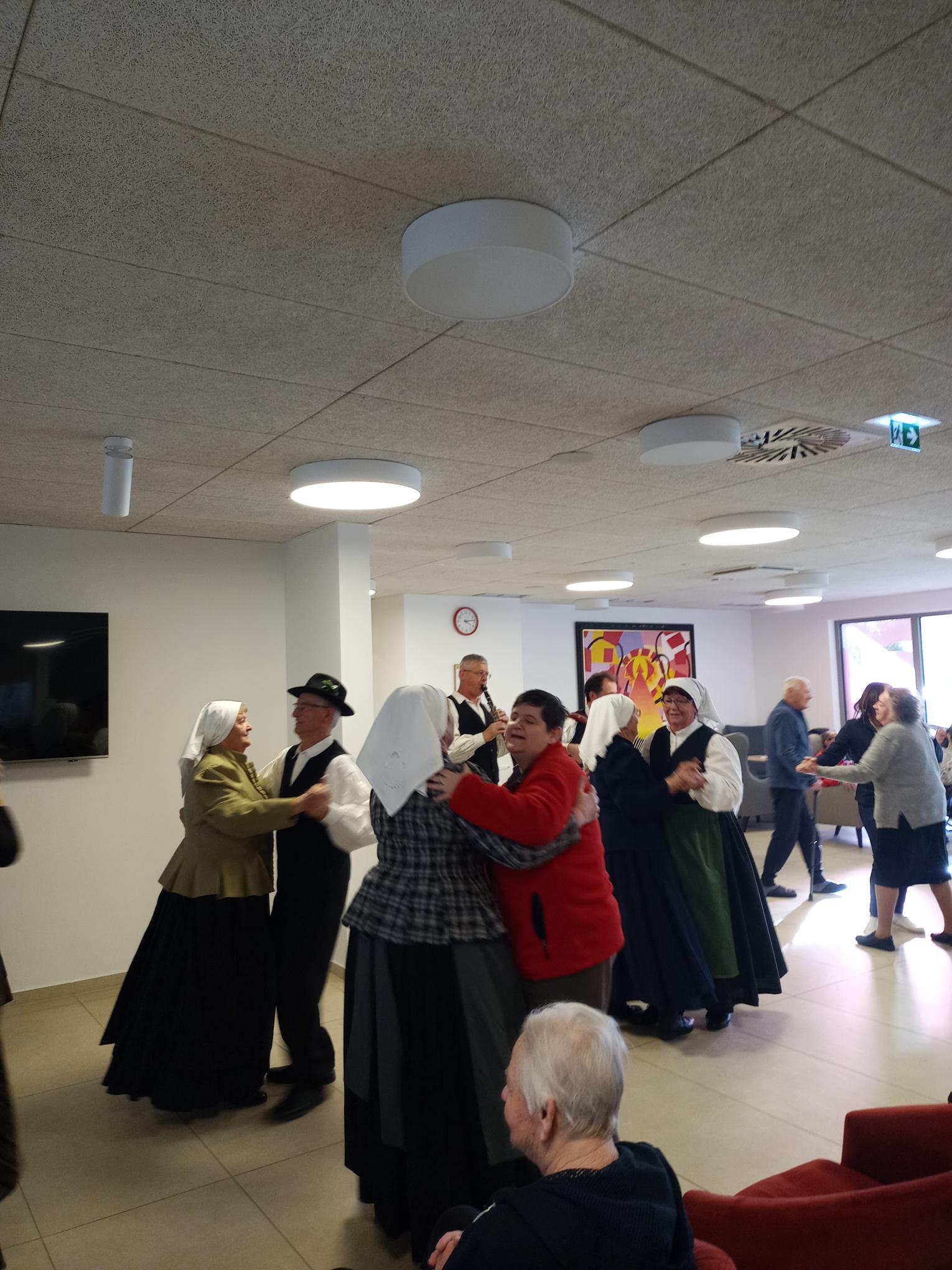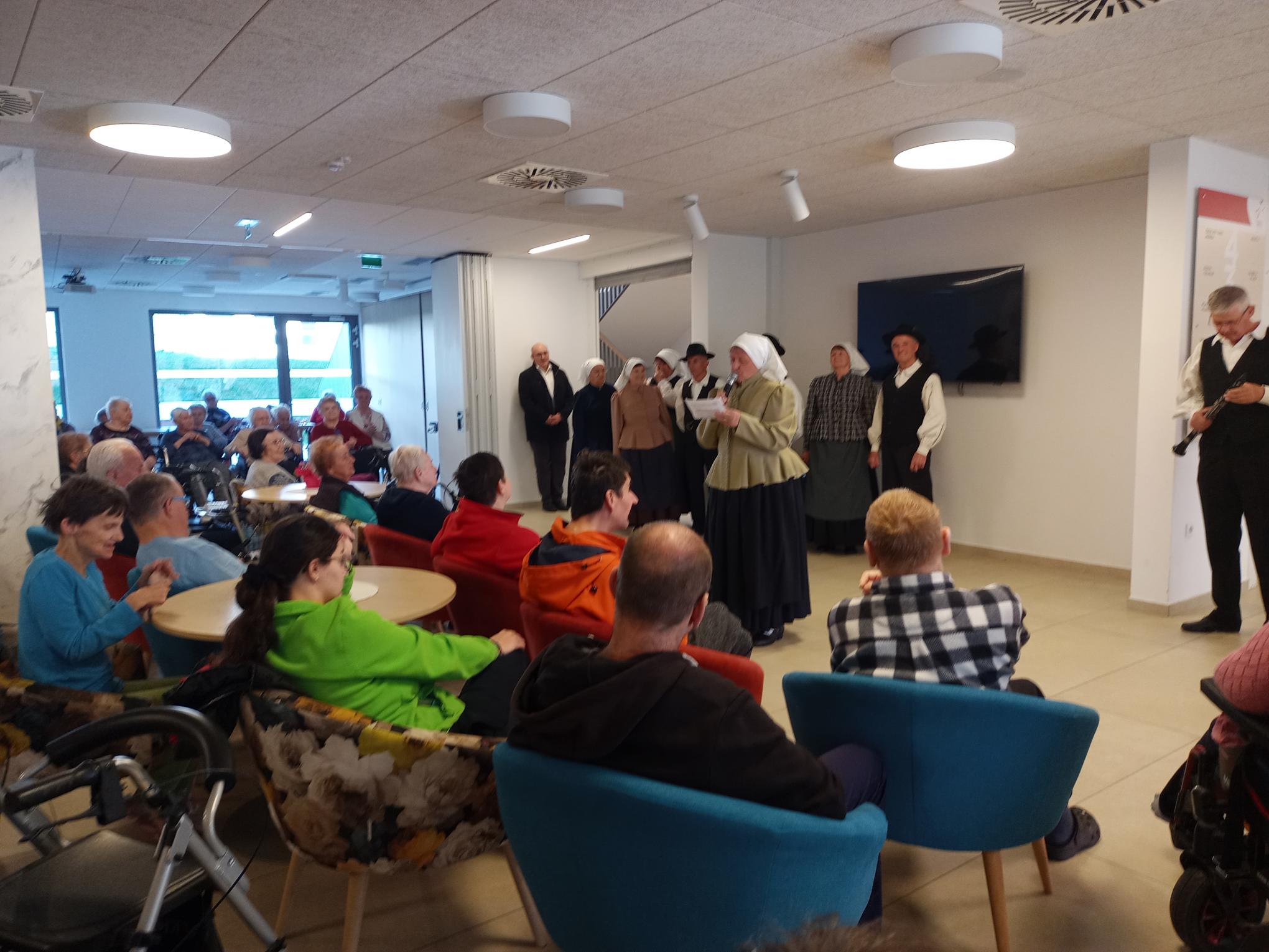 Z veseljem smo pričakali folklorno skupino, ki nam je pričarala bogastvo ljudskih plesov in pesmi. Ob njihovem nastopu smo se pridružili prepevanju, povabili pa so nas tudi na ples, kjer sta Peter in Irena z navdušenjem zaplesala.