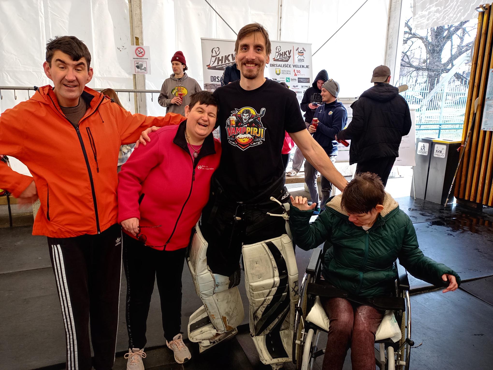 Ogledali smo si hokejski turnir rekreativnih igralcev hokeja na ledu na drsališču v Velenju. Varno za zaščitno mrežo smo navijali za igralce in vratarja, ki se je po tekmi tudi fotografiral z nami.